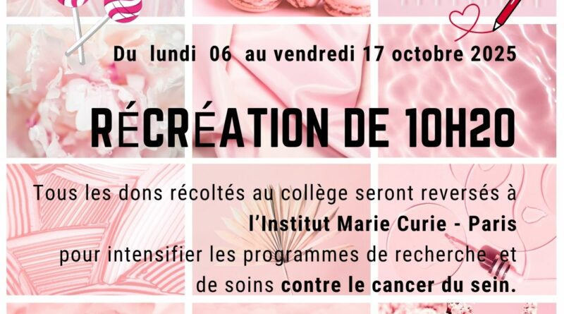 Cette année, notre collège se mobilise du lundi 6 octobre au vendredi 17 octobre pour soutenir cette cause. Plusieurs actions seront mises en place :